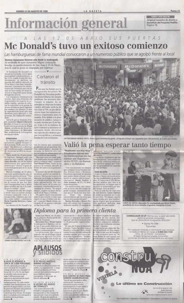 Página completa dedicada a la apertura de McDonald’s en Tucumán en La Gaceta del viernes 27 de Agosto de 1999.